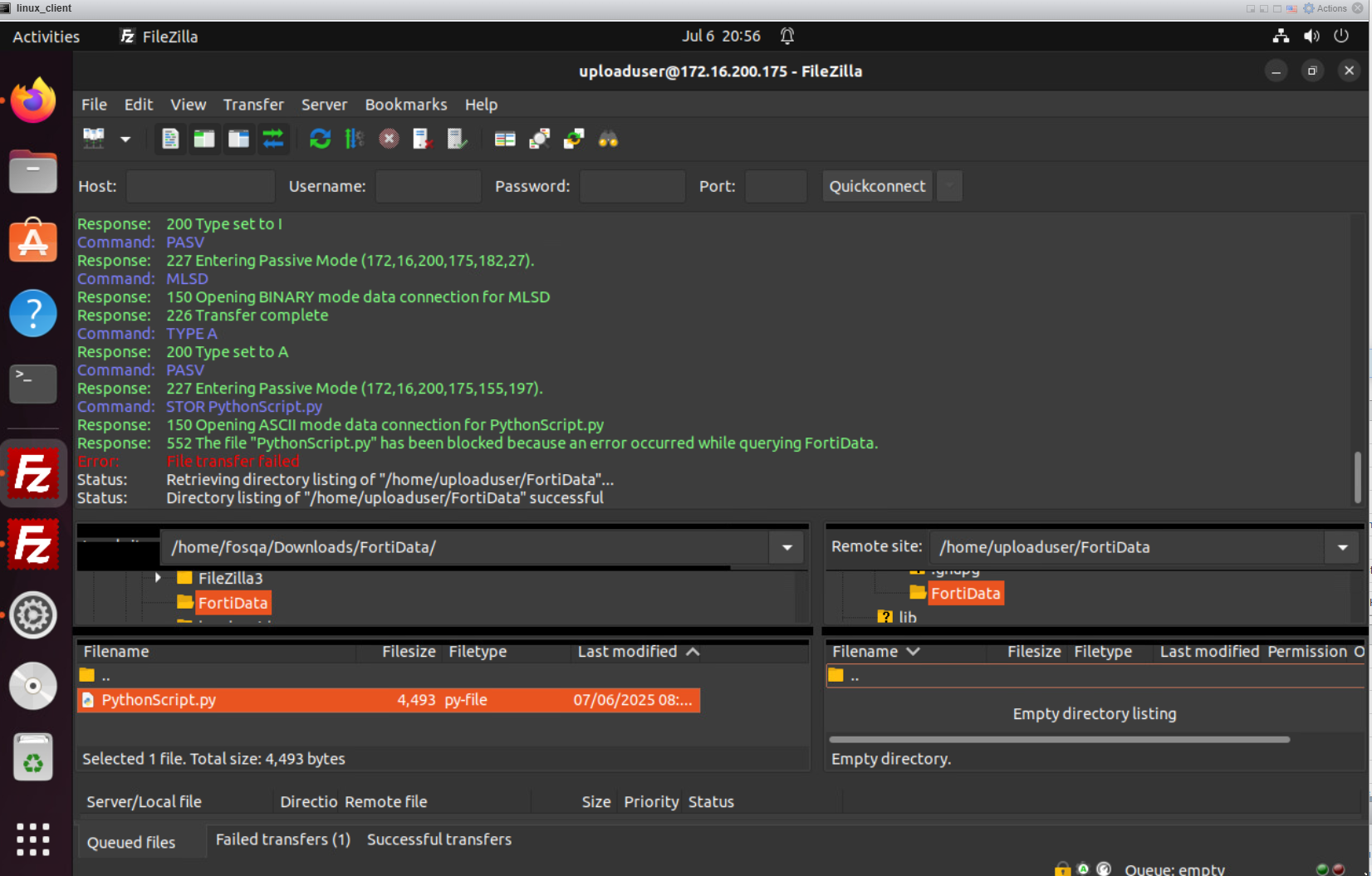 When the user attempts to post a PythonScript.py file through FTPS and the FortiData query fails, FortiGate blocks the attempt with an error message.