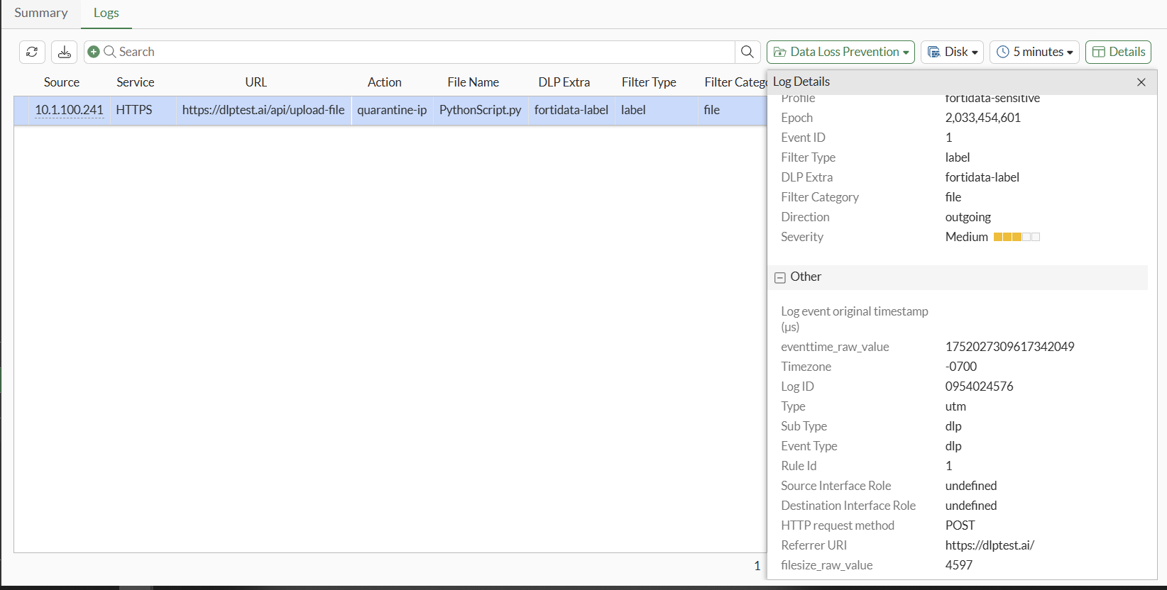 1: date=2025-07-08 time=19:15:09 eventtime=1752027309617342049 tz="-0700" logid="0954024576" type="utm" subtype="dlp" eventtype="dlp" level="warning" vd="vdom1" ruleid=1 dlpextra="fortidata-label" filtertype="label" filtercat="file" severity="medium" policyid=1 poluuid="19e776e0-5c63-51f0-9d68-3053988cbc21" policytype="policy" sessionid=3465 epoch=2033454601 eventid=1 srcip=10.1.100.241 srcport=37258 srccountry="Reserved" srcintf="port2" srcintfrole="undefined" srcuuid="dea915de-5c62-51f0-b993-090ad249da82" dstip=206.47.132.132 dstport=443 dstcountry="Canada" dstintf="port1" dstintfrole="undefined" dstuuid="dea915de-5c62-51f0-b993-090ad249da82" proto=6 service="HTTPS" filetype="python" direction="outgoing" action="quarantine-ip" hostname="dlptest.ai" url="https://dlptest.ai/api/upload-file" agent="Mozilla/5.0 (X11; Ubuntu; Linux x86_64; rv:139.0) Gecko/20100101 Firefox/139.0" httpmethod="POST" referralurl="https://dlptest.ai/" filename="PythonScript.py" filesize=4597 profile="fortidata-sensitive"