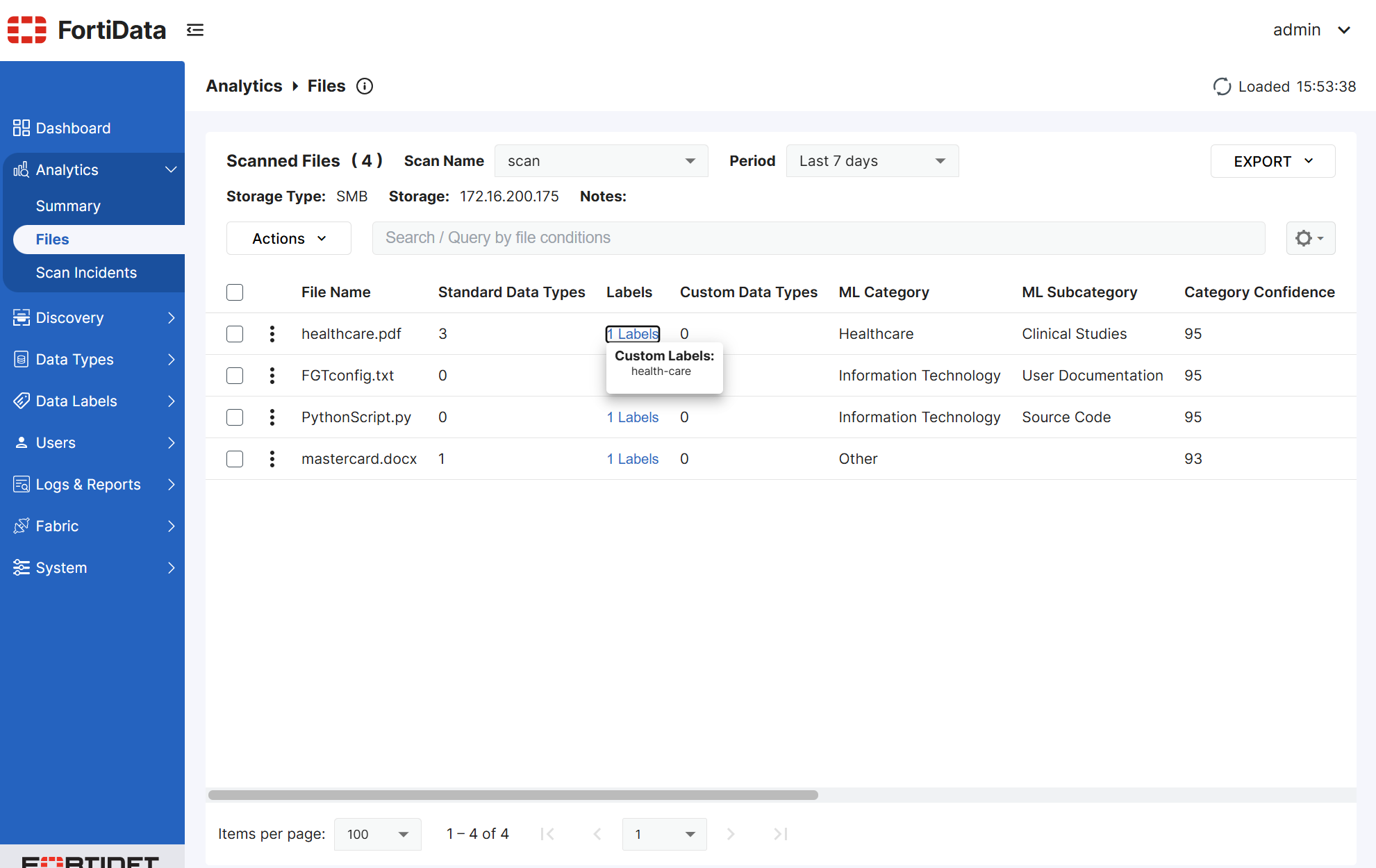 Following is an example FortiData file source with the labels health-care, credit-card, and python-source-code. Only the health-care label is visible in the screen shot: