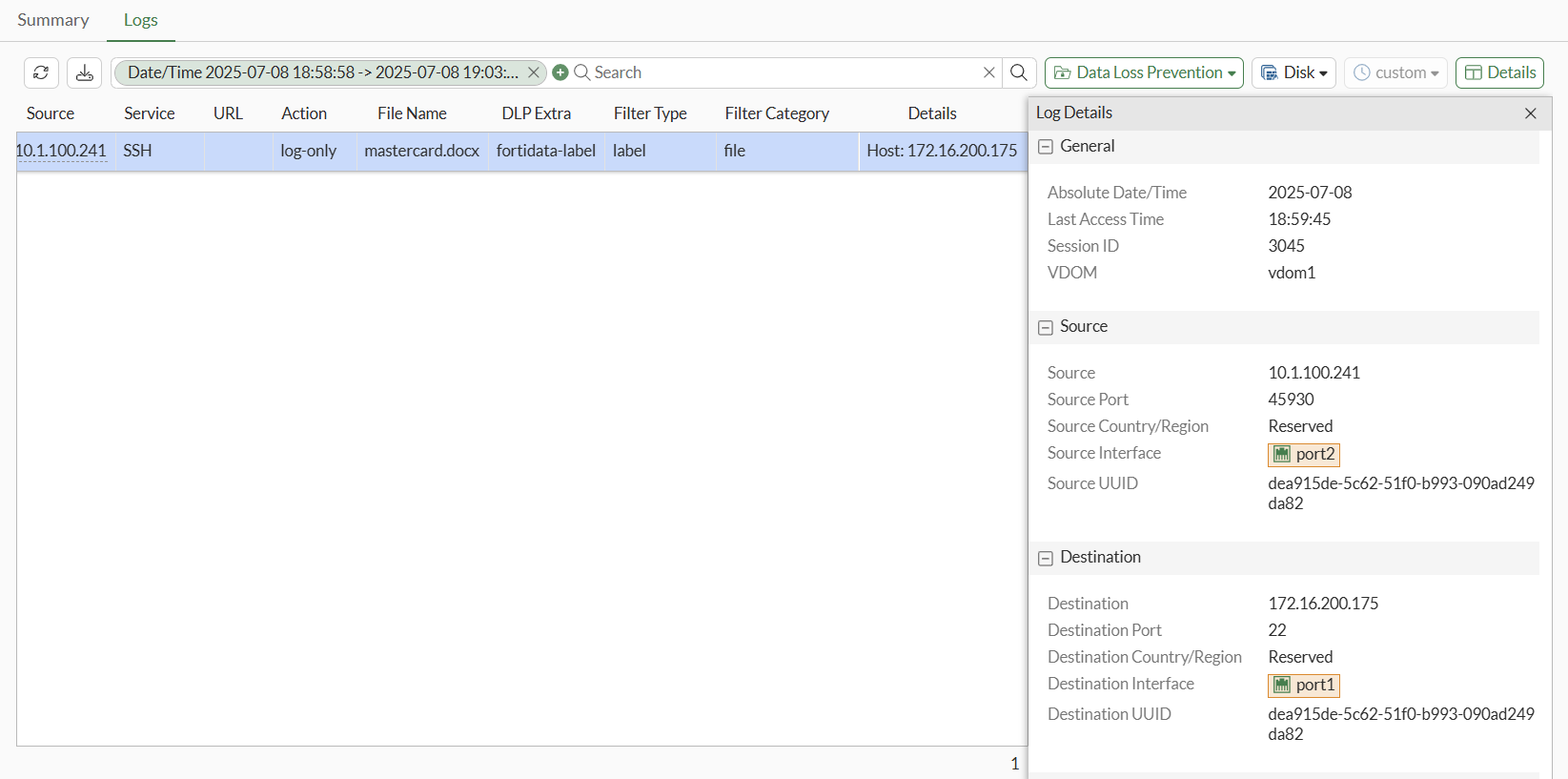 1: date=2025-07-08 time=18:59:45 eventtime=1752026384529707336 tz="-0700" logid="0954024577" type="utm" subtype="dlp" eventtype="dlp" level="notice" vd="vdom1" ruleid=1 dlpextra="fortidata-label" filtertype="label" filtercat="file" severity="medium" policyid=1 poluuid="19e776e0-5c63-51f0-9d68-3053988cbc21" policytype="policy" sessionid=3045 epoch=2033454538 eventid=0 srcip=10.1.100.241 srcport=45930 srccountry="Reserved" srcintf="port2" srcintfrole="undefined" srcuuid="dea915de-5c62-51f0-b993-090ad249da82" dstip=172.16.200.175 dstport=22 dstcountry="Reserved" dstintf="port1" dstintfrole="undefined" dstuuid="dea915de-5c62-51f0-b993-090ad249da82" proto=6 service="SSH" subservice="SCP" filetype="msofficex" direction="outgoing" action="log-only" filename="mastercard.docx" filesize=12604 profile="fortidata-sensitive"