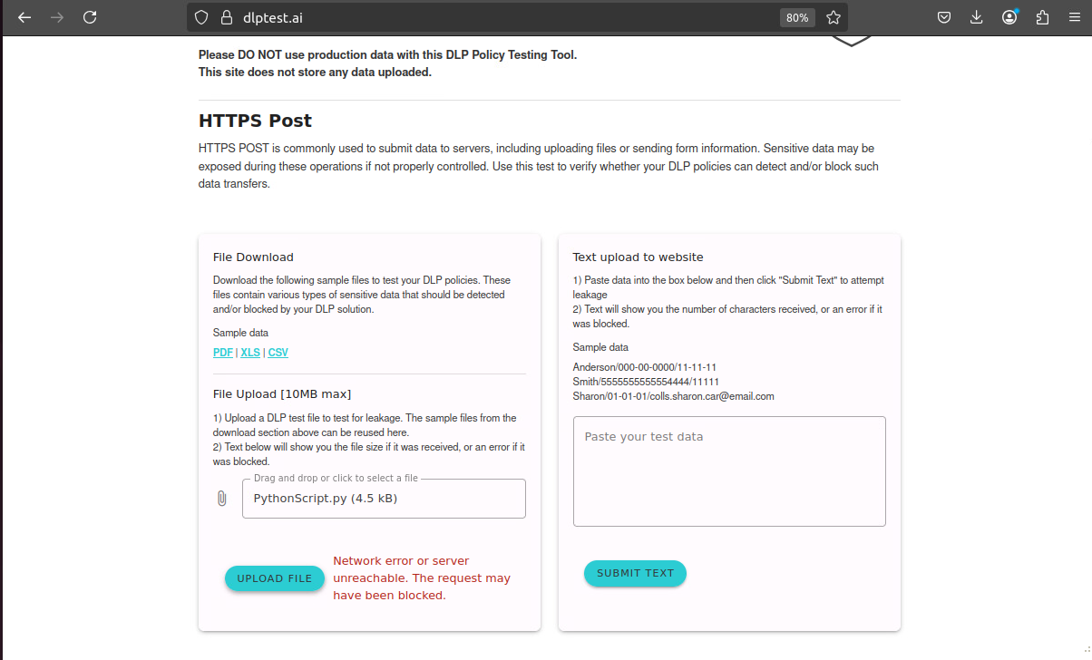 When the user attempts to post a PythonScript.py file through dlptest.ai that matches python-source-code FortiData label, FortiGate blocks the file and quarantines the IP: