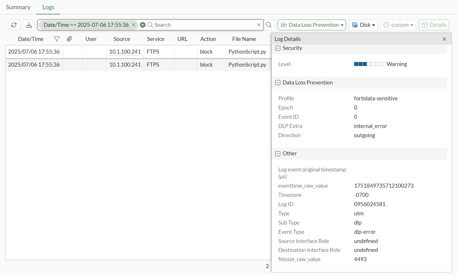 30: date=2025-07-06 time=17:55:24 eventtime=1751849724254438363 tz="-0700" logid="0956024581" type="utm" subtype="dlp" eventtype="dlp-error" level="warning" vd="vdom1" error="fortidata" dlpextra="internal_error" policyid=1 poluuid="8a20ddd4-5abf-51f0-3fcd-80a21a2eac18" policytype="policy" sessionid=3142 epoch=0 eventid=0 srcip=10.1.100.241 srcport=58837 srccountry="Reserved" srcintf="port2" srcintfrole="undefined" srcuuid="5146e274-5abf-51f0-48e4-5a4728500b83" dstip=172.16.200.175 dstport=40325 dstcountry="Reserved" dstintf="port1" dstintfrole="undefined" dstuuid="5146e274-5abf-51f0-48e4-5a4728500b83" proto=6 service="FTPS" filetype="python" direction="outgoing" action="block" filename="PythonScript.py" filesize=4493 profile="fortidata-sensitive"