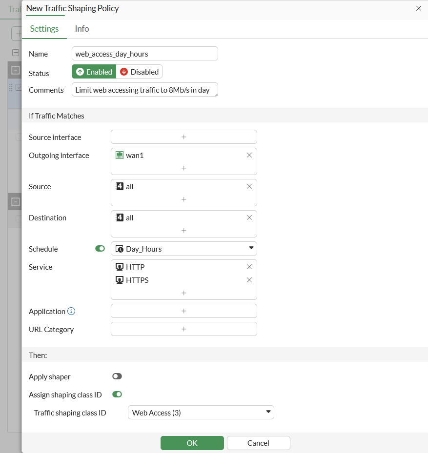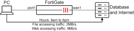 This example shows how to apply interface-based traffic shaping to web and file accessing traffic according to a schedule: