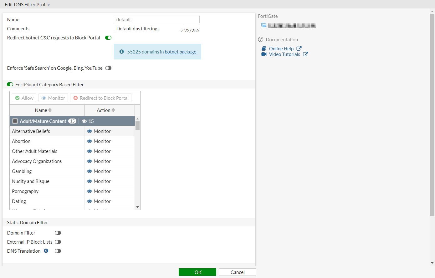 Go to Security Profiles > DNS Filter, and click Create New, or double-click an existing filter to open it for editing.