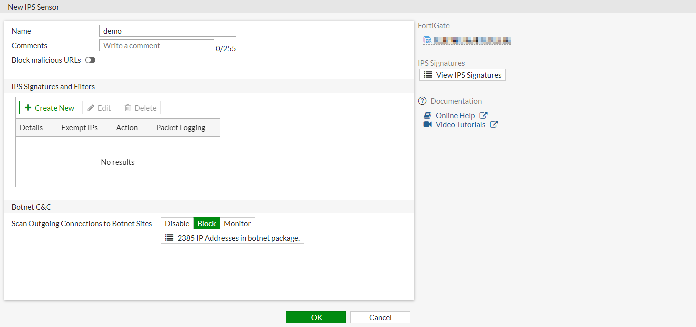 Go to Security Profiles > Intrusion Prevention, and click Create New to create a new IPS sensor, or double-click an existing IPS sensor to open it for editing.