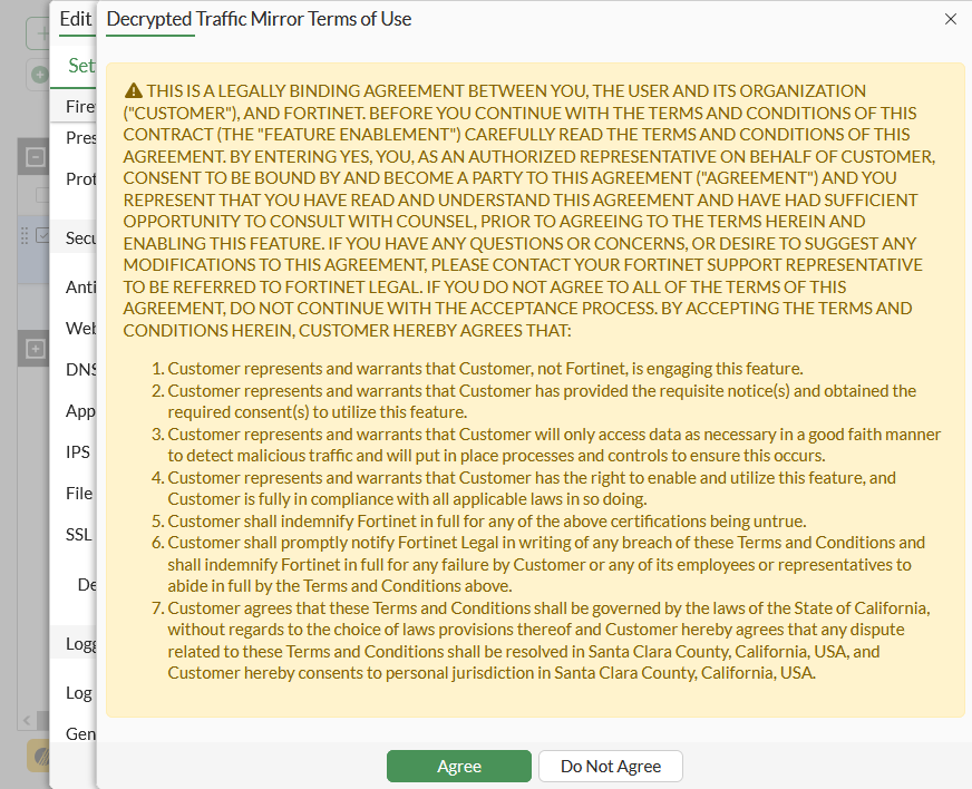 config firewall policy edit 1 set name "mirror-policy" set srcintf "port1" set dstintf "port2" set srcaddr "all" set dstaddr "all" set action accept set schedule "always" set service "ALL" set nat enable set ssl-ssh-profile "deep-inspection" set decrypted-traffic-mirror "SSL-to-port3" THIS IS A LEGALLY BINDING AGREEMENT BETWEEN YOU, THE USER AND ITS ORGANIZATION ("CUSTOMER"), AND FORTINET. BEFORE YOU CONTINUE WITH THE TERMS AND CONDITIONS OF THIS CONTRACT (THE "FEATURE ENABLEMENT") CAREFULLY READ THE TERMS AND CONDITIONS OF THIS AGREEMENT. BY ENTERING YES, YOU, AS AN AUTHORIZED REPRESENTATIVE ON BEHALF OF CUSTOMER, CONSENT TO BE BOUND BY AND BECOME A PARTY TO THIS AGREEMENT ("AGREEMENT") AND YOU REPRESENT THAT YOU HAVE READ AND UNDERSTAND THIS AGREEMENT AND HAVE HAD SUFFICIENT OPPORTUNITY TO CONSULT WITH COUNSEL, PRIOR TO AGREEING TO THE TERMS HEREIN AND ENABLING THIS FEATURE. IF YOU HAVE ANY QUESTIONS OR CONCERNS, OR DESIRE TO SUGGEST ANY MODIFICATIONS TO THIS AGREEMENT, PLEASE CONTACT YOUR FORTINET SUPPORT REPRESENTATIVE TO BE REFERRED TO FORTINET LEGAL. IF YOU DO NOT AGREE TO ALL OF THE TERMS OF THIS AGREEMENT, DO NOT CONTINUE WITH THE ACCEPTANCE PROCESS. BY ACCEPTING THE TERMS AND CONDITIONS HEREIN, CUSTOMER HEREBY AGREES THAT: 1. Customer represents and warrants that Customer, not Fortinet, is engaging this feature. 2. Customer represents and warrants that Customer has provided the requisite notice(s) and obtained the required consent(s) to utilize this feature. 3. Customer represents and warrants that Customer will only access data as necessary in a good faith manner to detect malicious traffic and will put in place processes and controls to ensure this occurs. 4. Customer represents and warrants that Customer has the right to enable and utilize this feature, and Customer is fully in compliance with all applicable laws in so doing. 5. Customer shall indemnify Fortinet in full for any of the above certifications being untrue. 6. Customer shall promptly notify Fortinet Legal in writing of any breach of these Terms and Conditions and shall indemnify Fortinet in full for any failure by Customer or any of its employees or representatives to abide in full by the Terms and Conditions above. 7. Customer agrees that these Terms and Conditions shall be governed by the laws of the State of California, without regards to the choice of laws provisions thereof and Customer hereby agrees that any dispute related to these Terms and Conditions shall be resolved in Santa Clara County, California, USA, and Customer hereby consents to personal jurisdiction in Santa Clara County, California, USA. Do you want to continue? (y/n) y next end