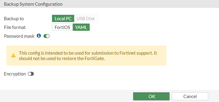 Enable Encryption to encrypt the configuration file. A configuration file cannot be restored on the FortiGate without a set password. Encryption is performed using AES-GCM algorithm. |