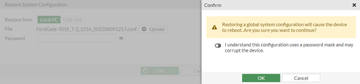 When restoring a configuration file that has password masking enabled, obfuscated passwords and secrets will be restored with the password mask.