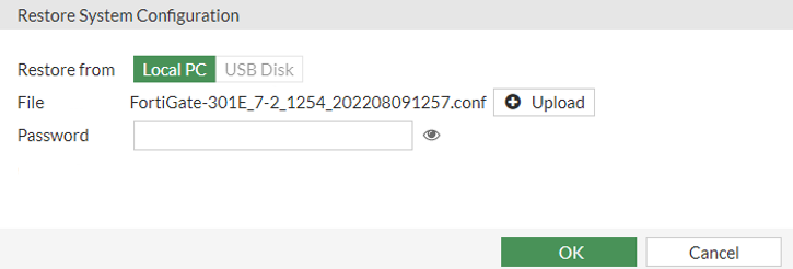 An admin trying to restore a FortiGate configuration with a password may look like this: