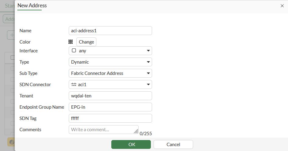 config firewall address edit "aci-address1" set type dynamic set sdn "aci1" set color 17 set tenant "wqdai-ten" set epg-name "EPG-in" set sdn-tag "fffff" next end