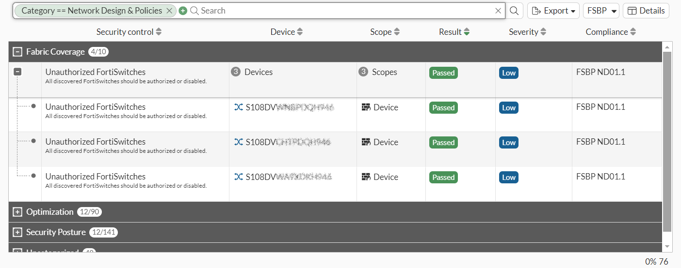 A report of details that is organized in the following security rating categories: Fabric Coverage (available for devices in a Security Fabric), Optimization, Security Posture, and Uncategorized. Expand each category to display rows of test details. Click each row to display the Test Details pane.