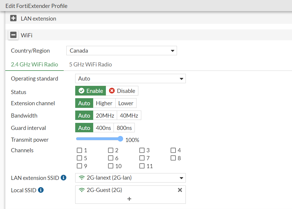 Use a FortiExtender profile to define the LAN extension settings, such as the radio band for the LAN extension SSID, to create a WiFi SSID.