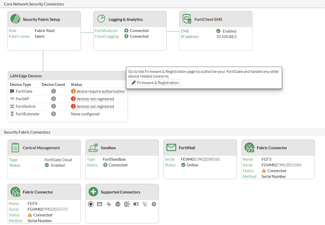 The Supported Connectors card displays the icons of different Fortinet devices that support full Security Fabric integration. See Configuring supported connectors for more information about configuring supported Fabric connectors.