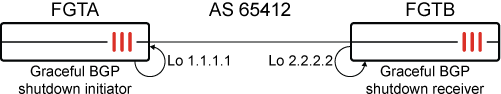 FGTA needs to be shut down for maintenance. To pre-emptively inform its peer (FGTB), FGTA uses graceful BGP shutdown to announce the shutdown and apply the gshut community to its routes. This allows FGTB to set all routes learned from FGTA to community gshut and lower the local-preference for those routes.