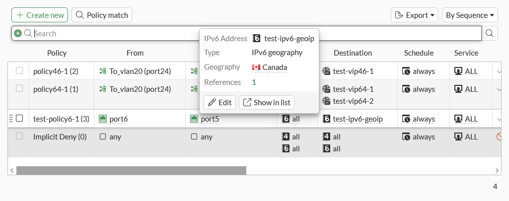 Geography-based IPv6 addresses can be created and applied to IPv6 firewall policies.