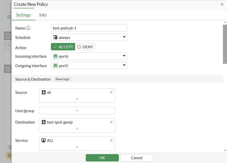 config firewall policy edit 1 set name "test-policy6-1" set srcintf "port6" set dstintf "port5" set srcaddr6 "all" set dstaddr6 "test-ipv6-geoip" set action accept set schedule "always" set service "ALL" set nat enable next end