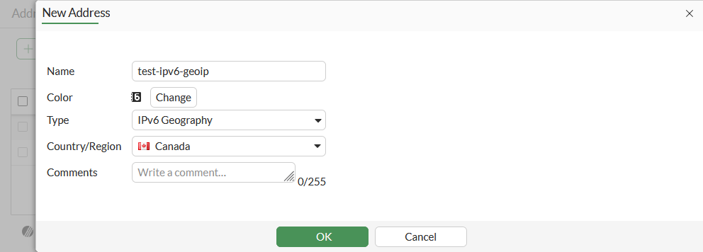 config firewall address6 edit "test-ipv6-geoip" set type geography set color 6 set comment "IPv6 Geography address" set country "CA" next end -