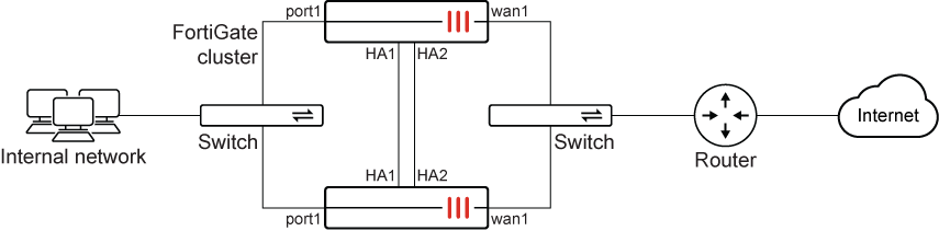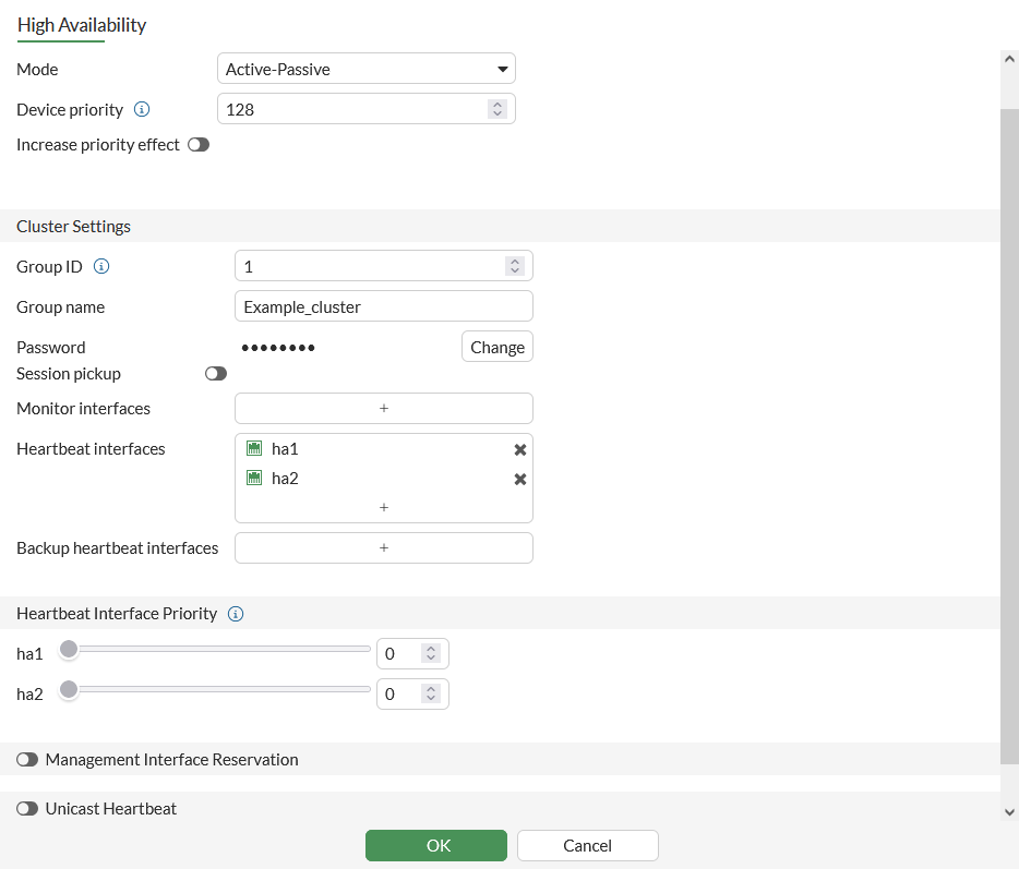 config system ha set mode a-p set group-id 1 set group-name Example_cluster set password ******** set hbdev ha1 10 ha2 20 end -