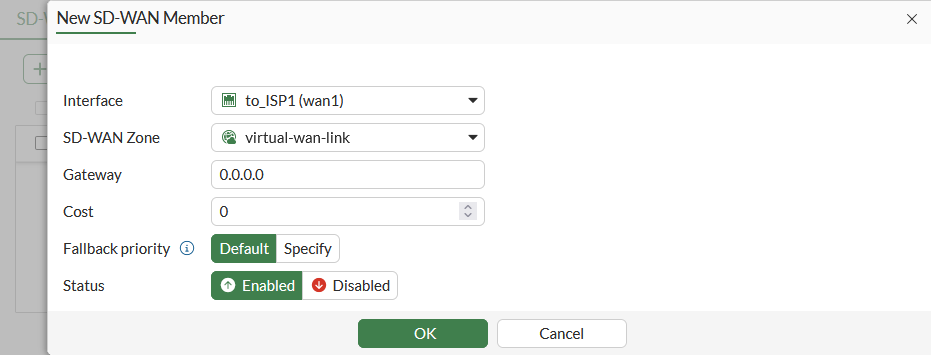 In this step, two interfaces are configured and added to the default SD-WAN zone (virtual-wan-link) as SD-WAN member interfaces. This example uses a mix of static and dynamic IP addresses; your deployment could also use only one or the other.