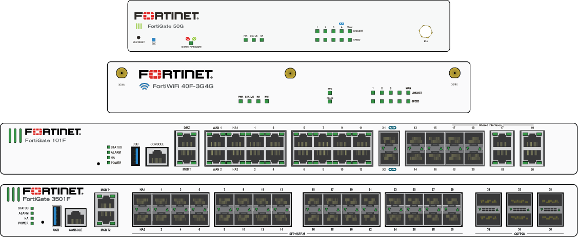 The following faceplates show examples of where the LEDs are typically found on FortiGate models: