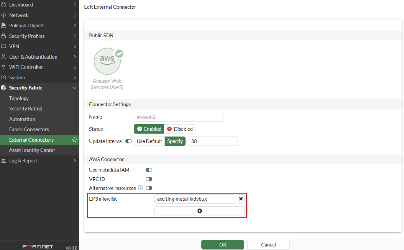 The AWS SDN connector now supports filtering of EKS clusters. If the allow-list contains at least one entry, only clusters explicitly included in the allow-list will be resolved by the AWS SDN connector. Clusters not in the allow-list will be excluded from dynamic address object resolution. As a result, AWS resource resolution performance is improved.