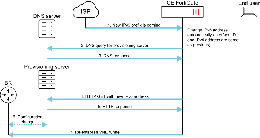The FortiGate updates the DDNS server with its IPv6 address whenever it updates, which in turn provides the update to the MAP distribution server and BR so they know how to resolve the FortiGate by hostname.