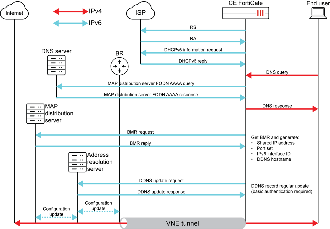 The FortiGate sends a MAP rule request to the MAP distribution server once the IPv6 address is configured on the FortiGate by RS/RA. Next, the FortiGate will send an AAAA query to get the IPv6 address of the MAP distribution server. After sending the BMR request to the MAP distribution server, the FortiGate will get the IPv4 address, port set, BR IPv6 address, and hostname of the address resolution server from the BMR reply. The VNE tunnel between the FortiGate and BR is now established.