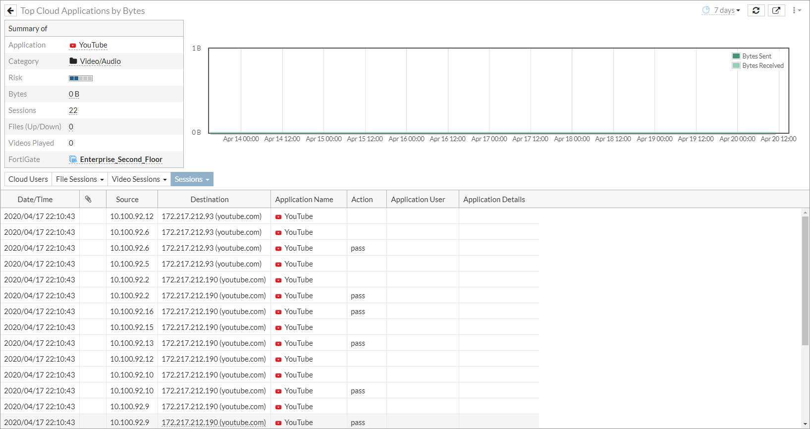 Open the monitor. If SSL deep inspection is enabled in the related firewall policy, then the monitor shows the additional details that are logged, such as Files (Up/Down) and Videos Played.
