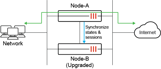 Administrators can manually trigger failover to make Node-B the new primary when ready. This can be done by resetting the HA uptime or changing device priorities, whichever method is desired. Traffic now passes through Node-B.