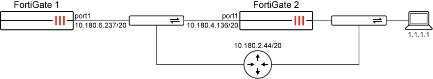 The following example demonstrates the configuration of static routes between two FortiGates. There is a host behind FortiGate 2 with an IP address of 1.1.1.1. FortiGate 1 has multiple paths to reach the host.