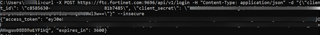 curl -X POST https://fic.fortinet.com:9696/api/v1/login -H "Content-Type: application/json" -d "{\"client_id\": \"c8585630**************81b7485\", \"client_secret\": \"************************************Wl3w==\"}"
