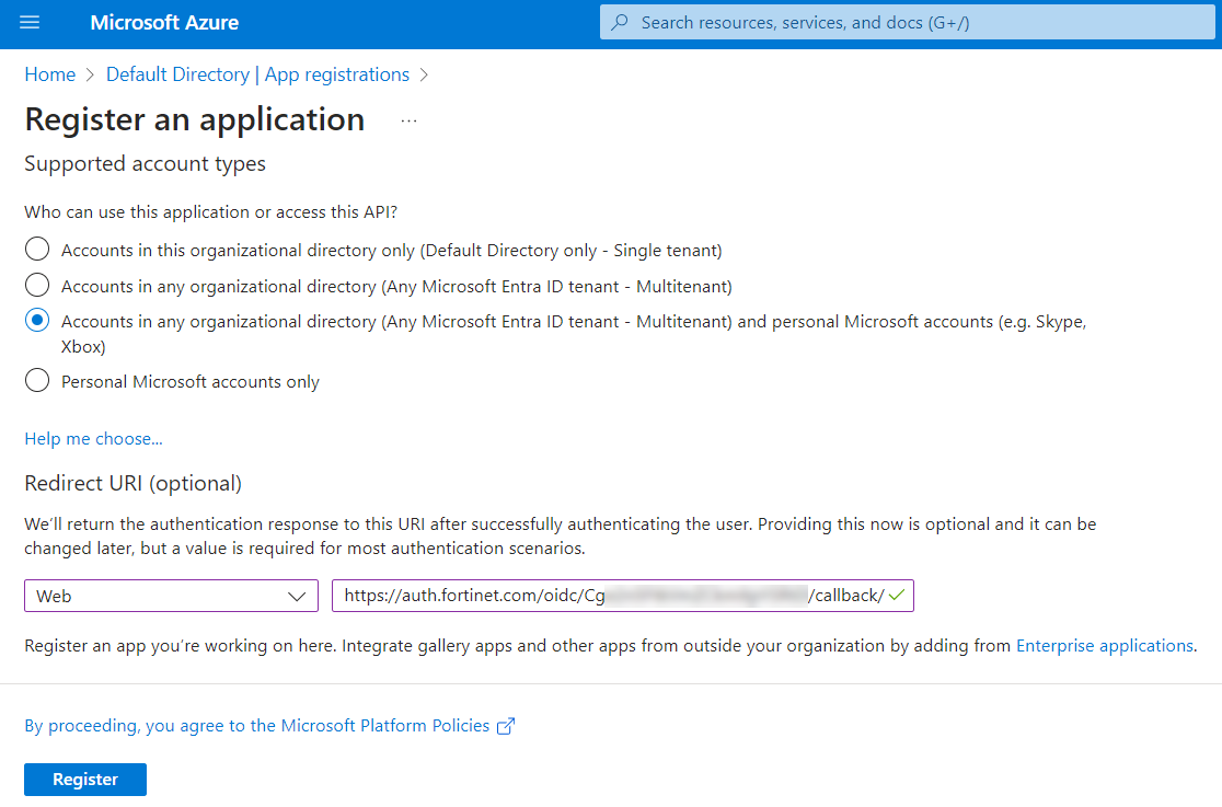 On FIC, create a new user source and set the Interface to OIDC just like in the Google OIDC example. Take note of the callback URL. Then, on the next page in Azure, fill in your application name, select Accounts in any organizational directory (Any Azure AD directory - Multitenant) and personal Microsoft accounts (e.g. Skype, Xbox) to allow anyone to log in, add a Web Redirect URI with the callback URL from FIC, and click Register.