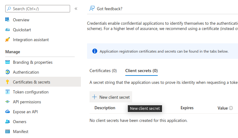 On that resulting page, copy the Client Id (under Application (client) ID, and click Add a certificate or secret:
