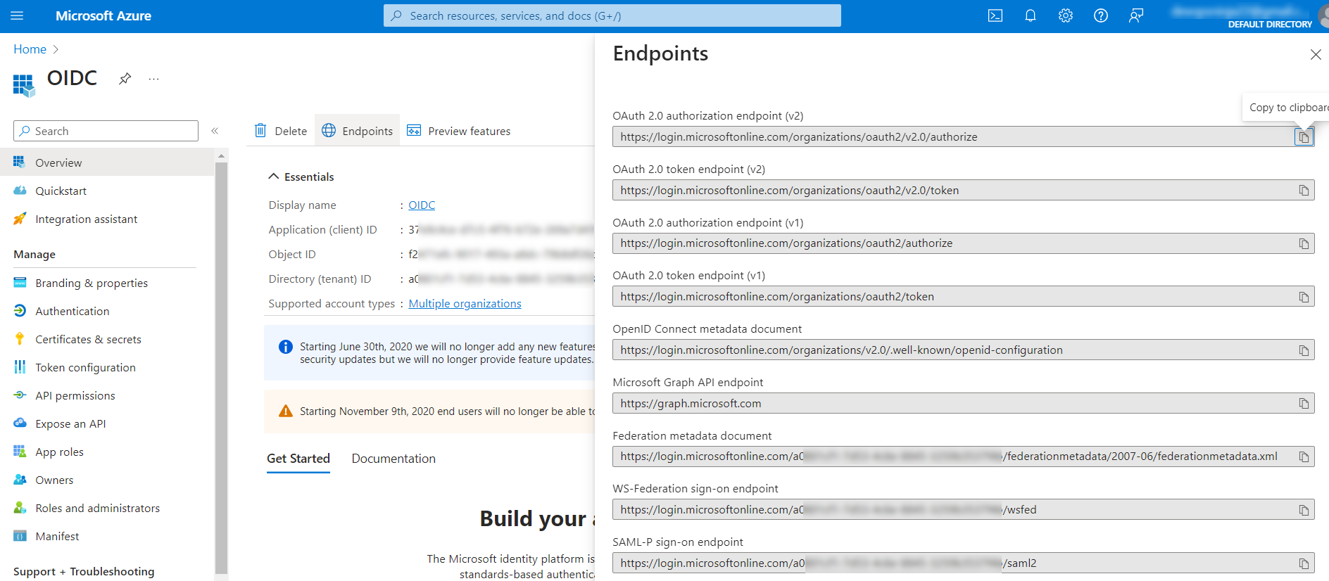 You already got the client and the secret from earlier. If you need to reference the other fields, you can get it from here in Azure by clicking Endpoints in the Overview page of your app: