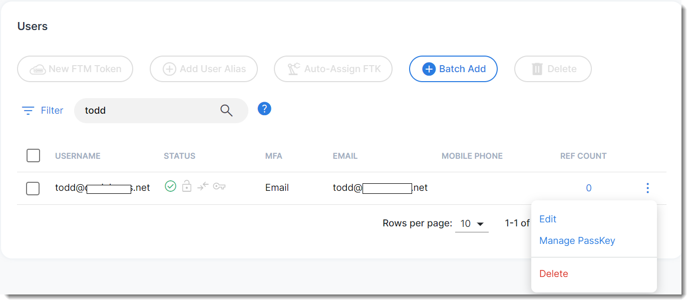 - Click User Management > Users, search for the user, "Todd", in the following example, and choose Manage Passkey from the tool menu.