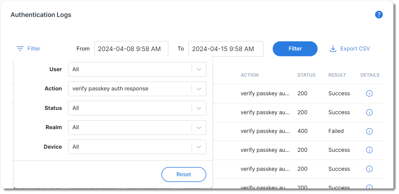 - Navigate to Log and Report >Management Logs, click Filter, and select verify passkey auth response in the Action column to narrow down the search to passkey auth responses.