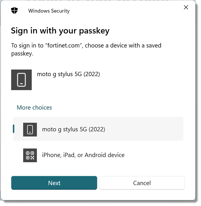 - John chooses Security key to use the FortiToken 410 USB passkey.