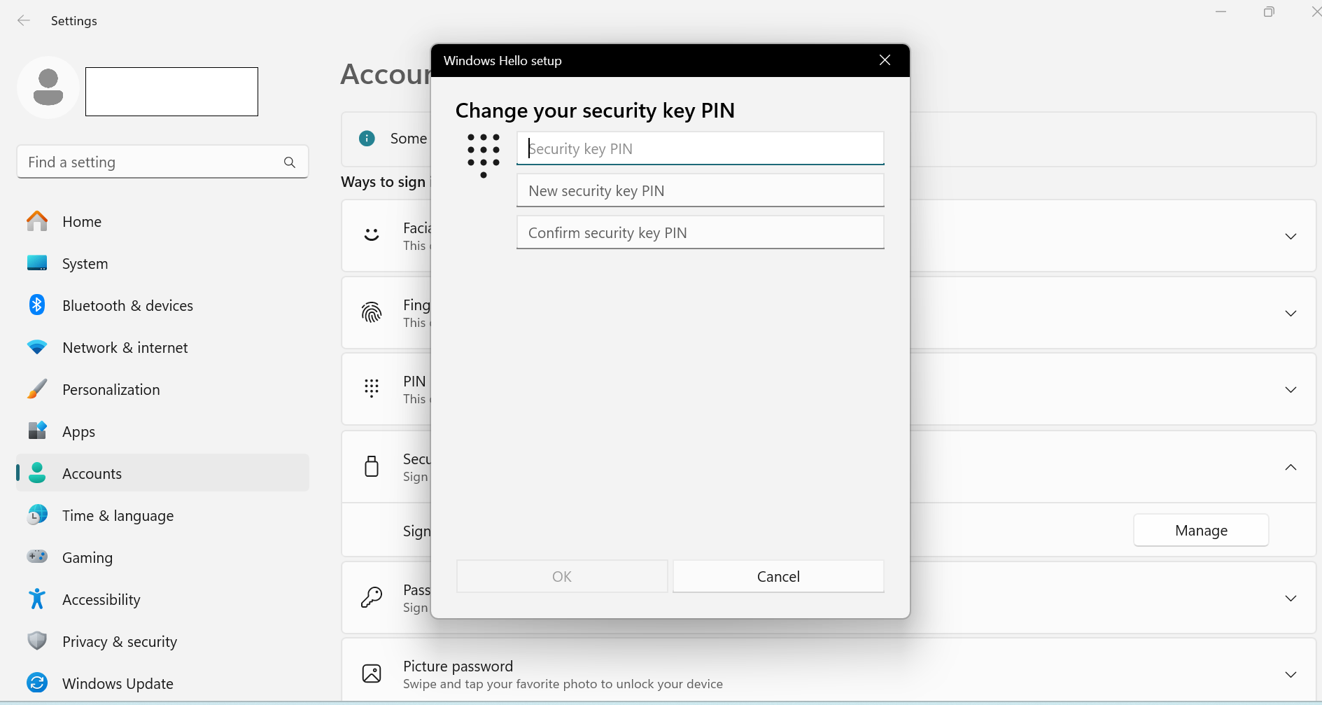 - Choose Security Key PIN and set up a PIN for the key.