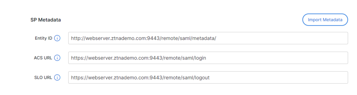 webserver.ztnademo.com:9443.Note: The Entity ID, Assertion consumer service URL, and Single logout service URL will be updated.