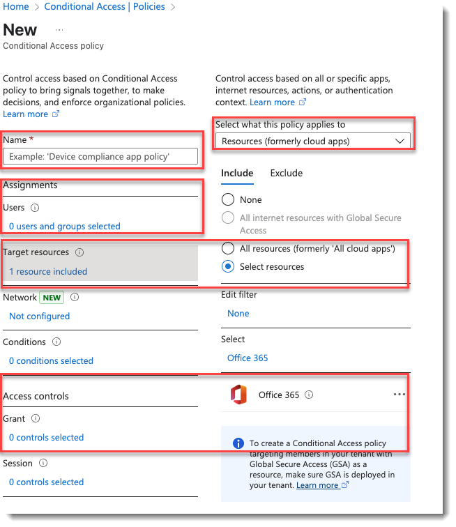 Create a new policy, and assign users or groups to it. For Target resources, select All resources (formerly 'All cloud apps') or Selected resources. (Note: If you choose Selected resources, you must select one, for example, Office 365.)