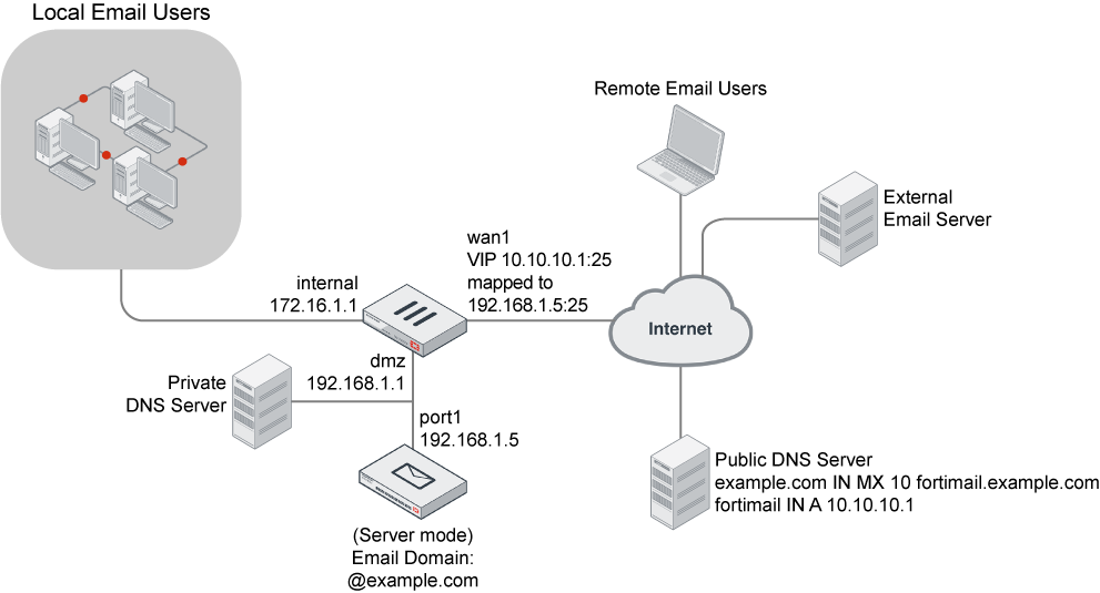 Server mode requires some changes to an existing network. Requirements include MX records on public DNS servers for each protected domain. The records must refer to the FortiMail unit. You may also need to configure firewalls or routers to direct SMTP traffic to the FortiMail unit.