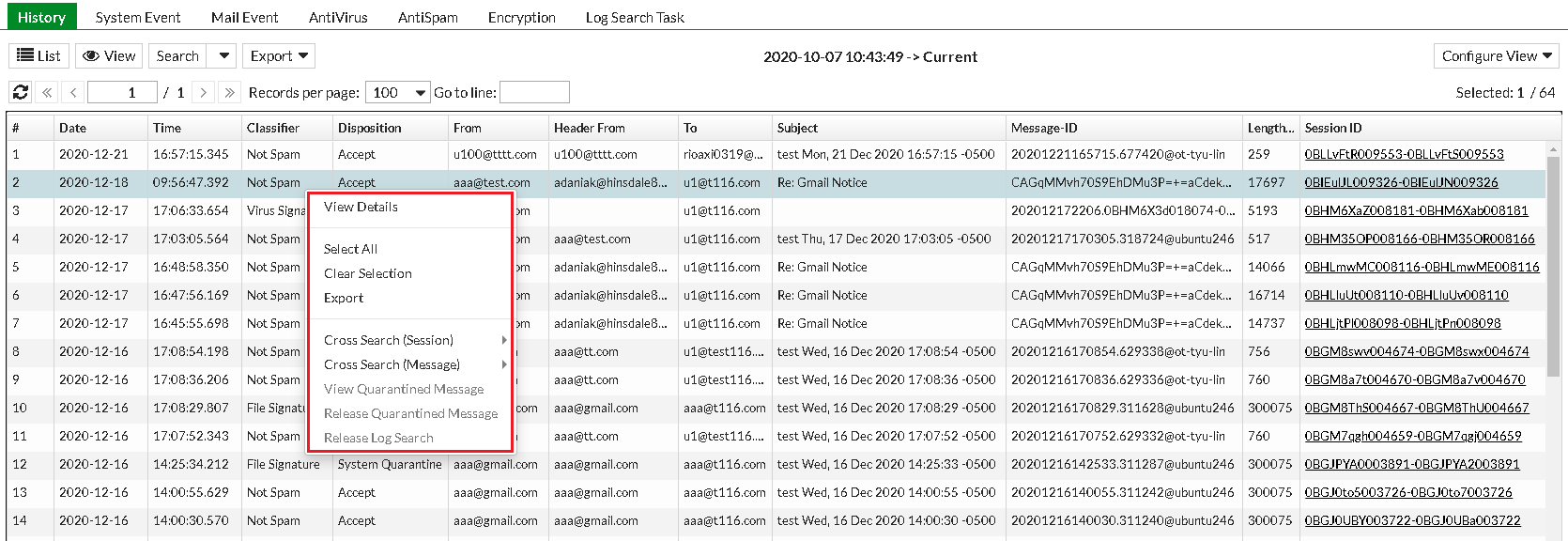 When viewing quarantine logs on the History tab, select one or multiple log entries of the “System Quarantine” messages, then from the right-click menu, select the Release Log Search option to release the selected message/messages. A message will show that the qurantined message was released, along with all logs related to the email being quarantined. |