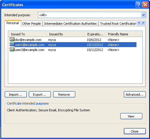 The certificate and private key are now imported to the Personal certificate store in the end-user browser. The browser is now has the appropriate client certificate for PKI authentication on the FortiMail unit.