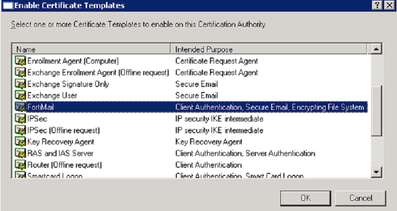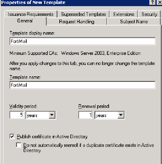 MMC comes with a variety of certificate templates. However, none of those templates are designed to meet the specific needs of FortiMail. A custom certificate template includes all information required by the FortiMail certification authority (CA) server to establish the identity of the client and create trusts for the secure exchange of information.