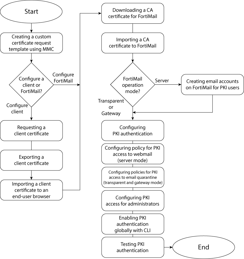 Example PKI configuration work flow is a work flow diagram that shows an example method for requesting, generating and delivering client certificates to FortiMail end-users and administrators, and for configuring the FortiMail unit for PKI authentication. The procedures cover PKI authentication requirements for FortiMail server, transparent and gateway operation modes. Each block in the work flow diagram is supported by a detailed procedure to complete the task.