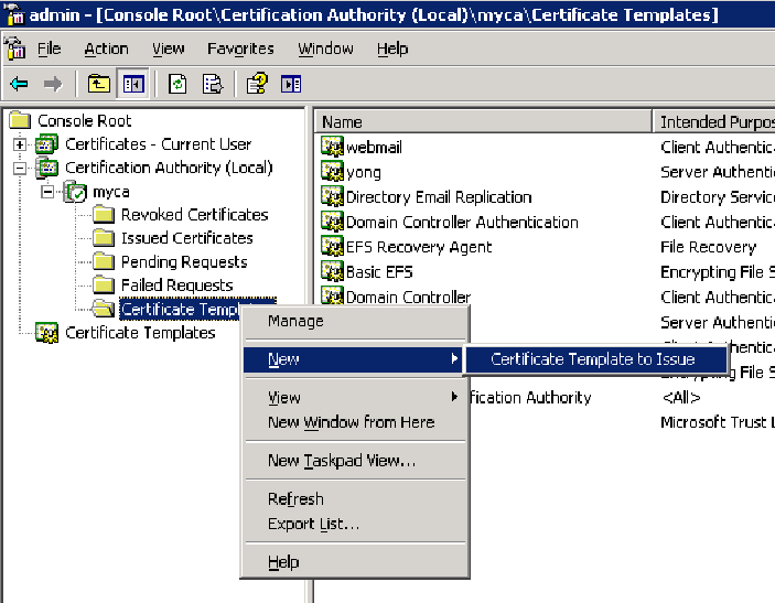 - Right-click Certificate Template and select New > Certificate Template to Issue.