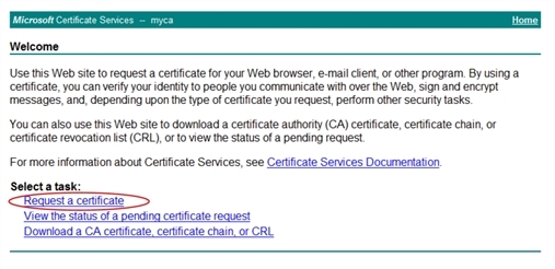 - Return to the Microsoft Certificate Services (MSCS) home page for your local CA and repeat steps Select the Request a certificate link. through If a message appears, warning you that the web site is adding one or more certificates to your computer, click Yes to proceed. for each end-user that will communicate with FortiMail using PKI authentication.
