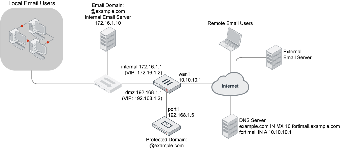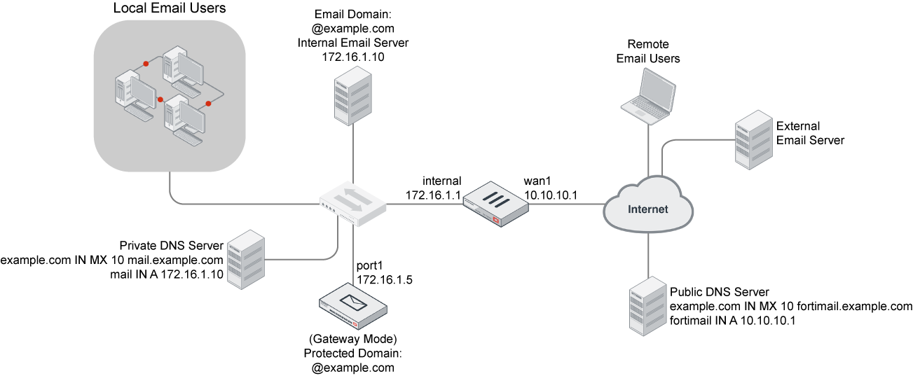 In this example, a FortiMail unit operating in gateway mode, a protected email server, a private DNS server, and email users’ computers are all positioned within a private network, behind a firewall. Remote email users’ computers and external email servers are located on the Internet, outside of the network protected by the firewall. The FortiMail unit protects accounts for email addresses ending in “@example.com”, which are hosted on the local email server.