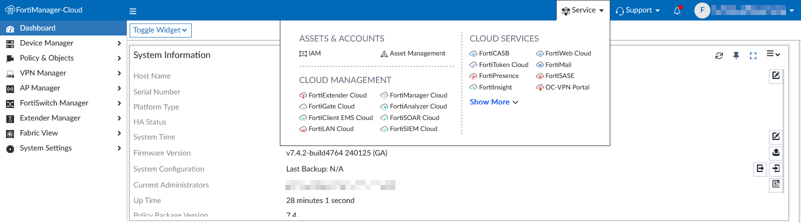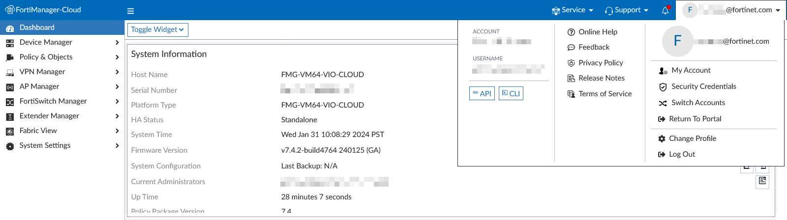 The account dropdown includes links and services related to your FortiCloud account and the FortiManager instance. Available options include the following: