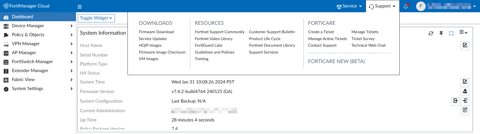 You can access FortiCloud services and support links from the FortiManager Cloud toolbar.